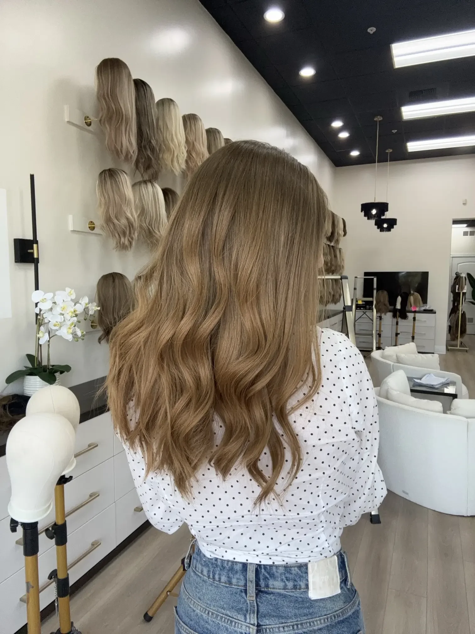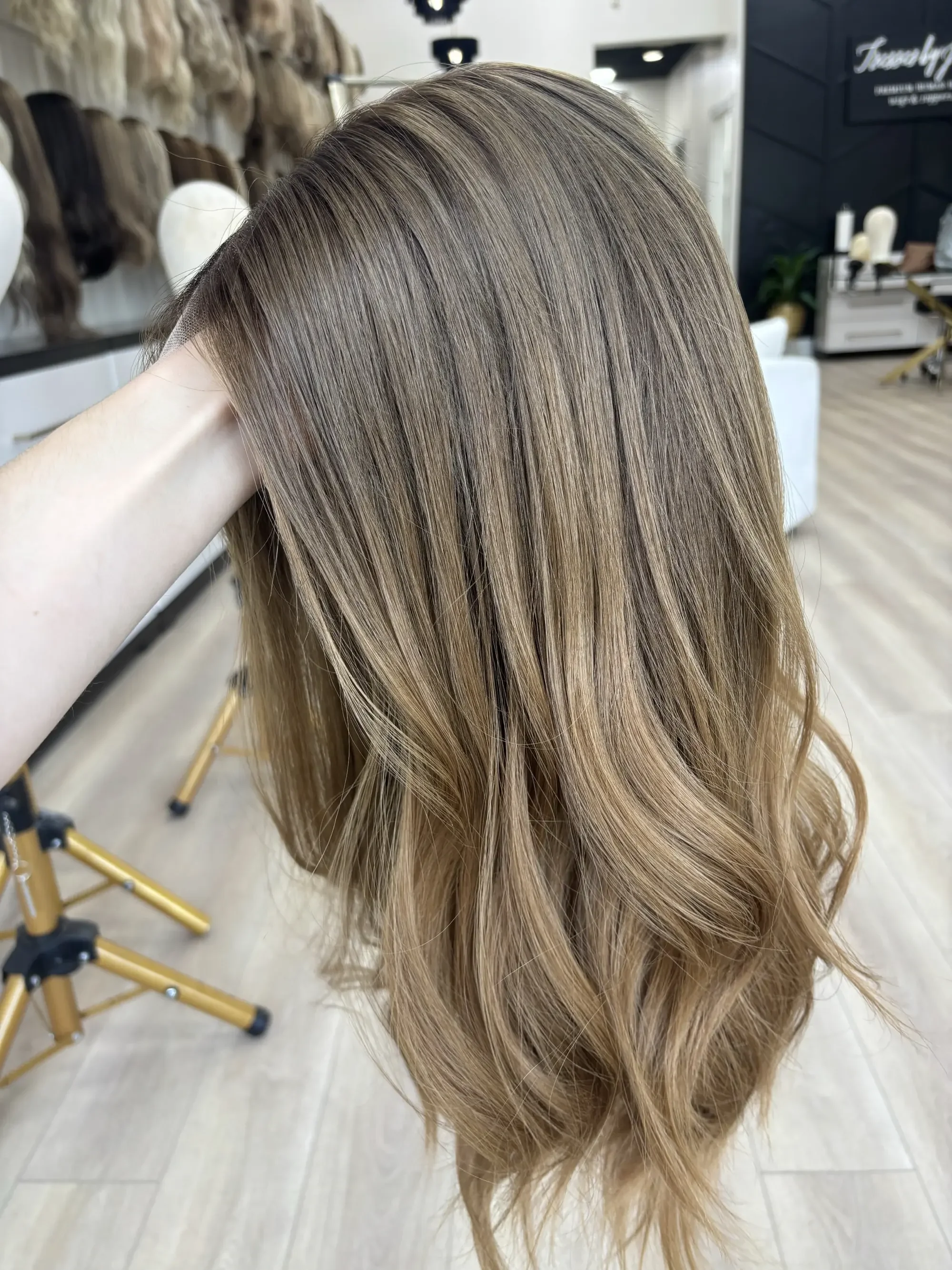 • Sun kissed honey blonde with lighter neutral blonde highlights mixed in. Level 6 root smudge and lowlights