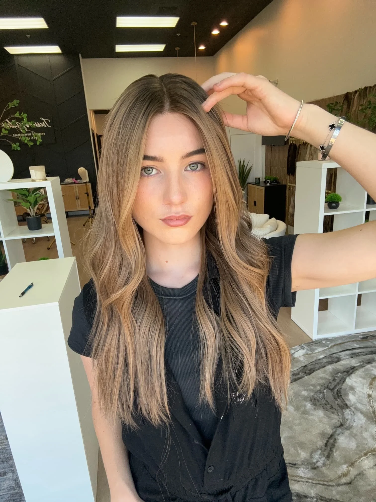• Level 6 Root and lowlights light golden honey dimensional blonde