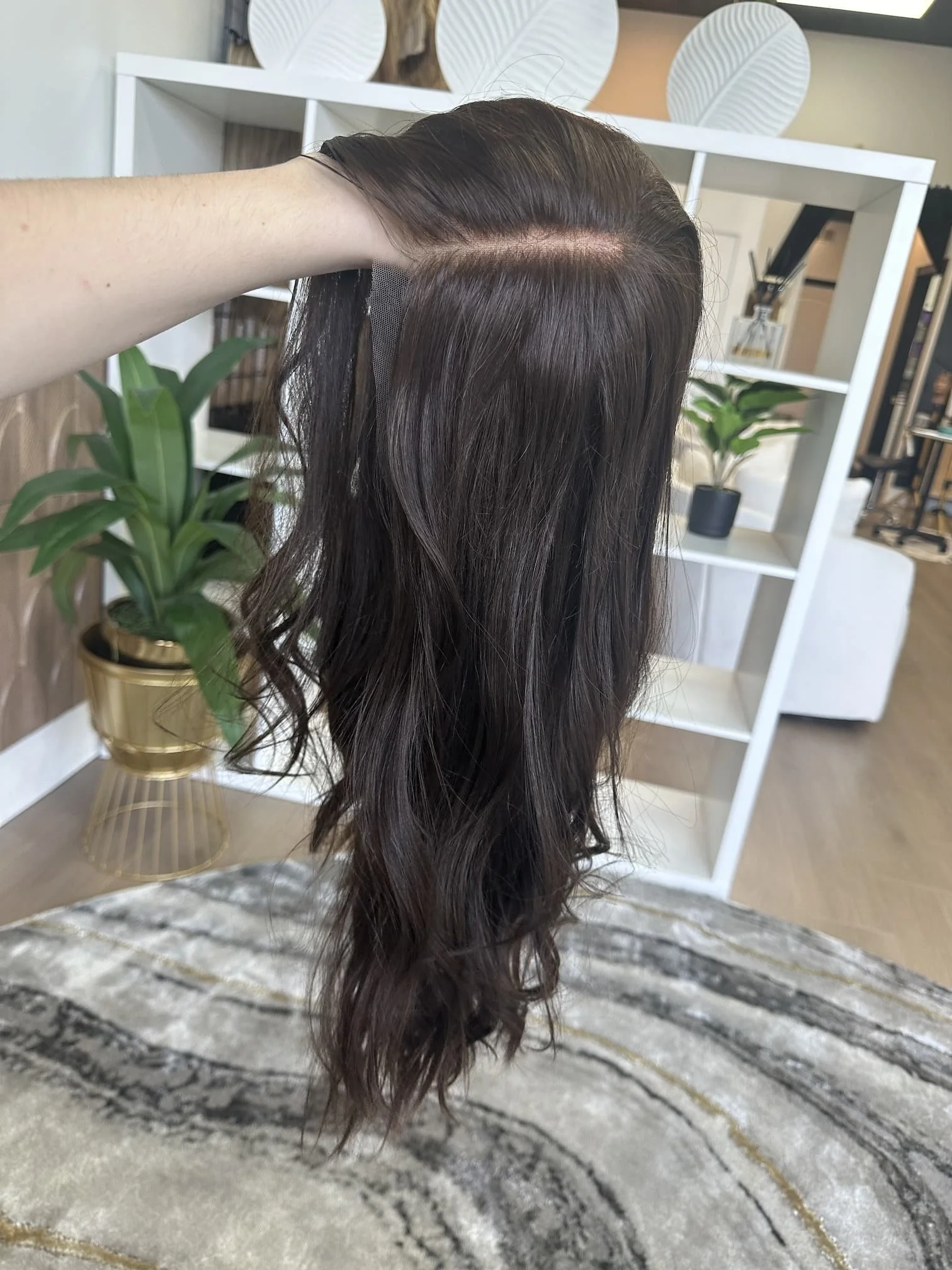 Hair length is measured from the top middle crown on the lace/silk top to the longest ends (example: on a 3.5x5 lace front it’s measured 2.5” back from the hairline to the longest ends).